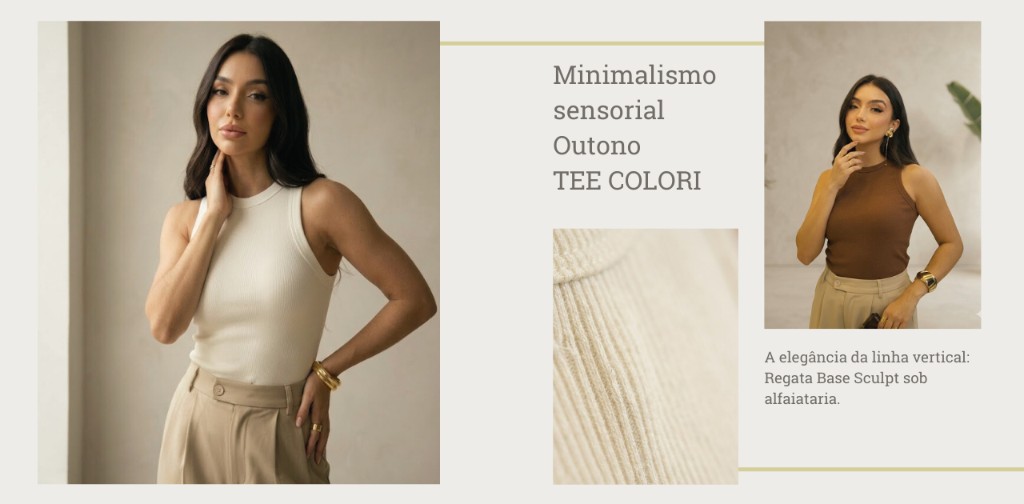 Como aplicar: Use uma Regata Sculpt Panna (Cloud Dancer) sob um blazer de alfaiataria aberto. Essa "linha vertical" limpa visualmente o look e transmite uma imagem de clareza e poder instantâneos.