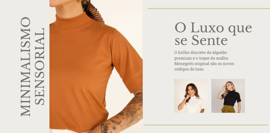 Em 2026, o básico "liso" deu lugar ao básico com textura. O foco agora é o Minimalismo Sensorial. O brilho discreto do algodão premium e o toque da malha Menegotti original são os novos códigos de luxo. É o luxo que não precisa de gritar para ser percebido.
